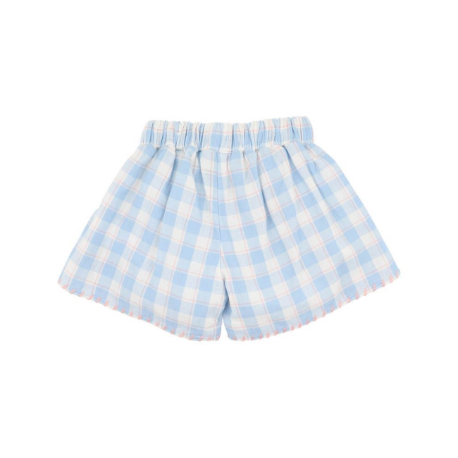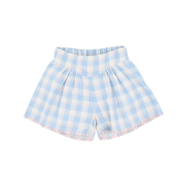 Sweet, soft and full of charm, these check shorts are perfect for sunny day adventures. Made in a pastel check with soft gathers and finished with contrast pink blanket stitch along the hem, these shorts are designed for playful comfort and style.