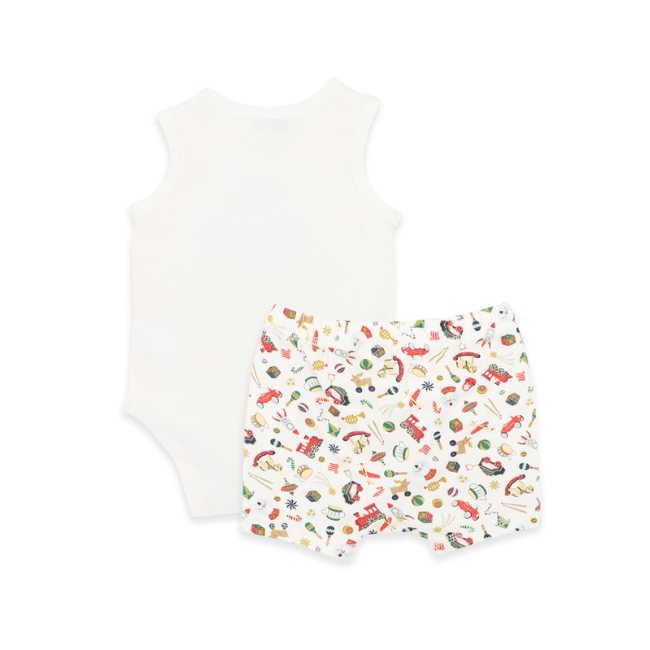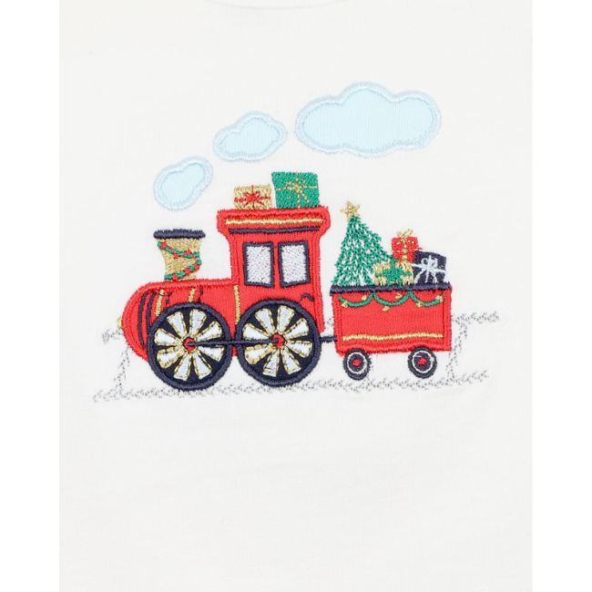 Bebe - Festive: Train Singletsuit + Short SetAll aboard the festive express! This two-piece set is bursting with nostalgic toy charm, featuring a playful train embroidery and all-over vintage toy print. Soft and stretchy for everyday comfort, it’s a cheerful outfit for little ones to explore and play in all season long.