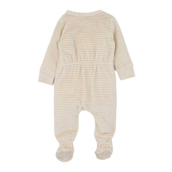 Soft, cosy and thoughtfully designed, this velour zip onesie is made for everyday comfort and easy wear. Crafted from a plush organic cotton blend with gentle stretch, it features a sweet all-over stripe and a charming sheep boucle embroidery at the front. Finished with enclosed feet and a practical zip front with fold-over zip facing, it’s a beautiful blend of comfort and function for cooler days and nights.