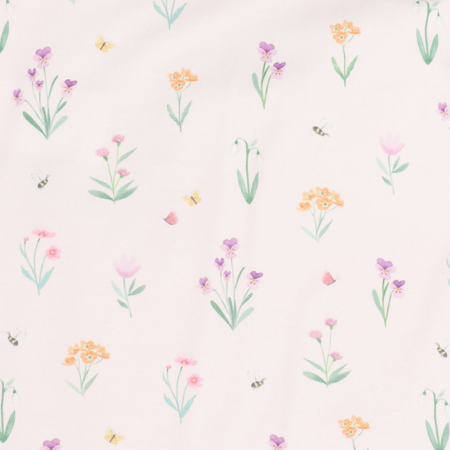 - All-over floral print with scattered bees and butterflies