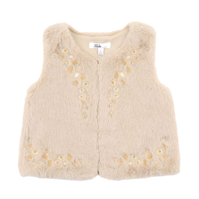Bebe - Winnie: Embroidered Faux Fur VestA dreamy little layering piece for cooler days, this soft faux fur vest adds warmth, texture and a sprinkle of sweetness to any outfit. With delicate floral embroidery and a cosy cotton lining, it’s perfect for dressing up special looks or adding charm to everyday wear.