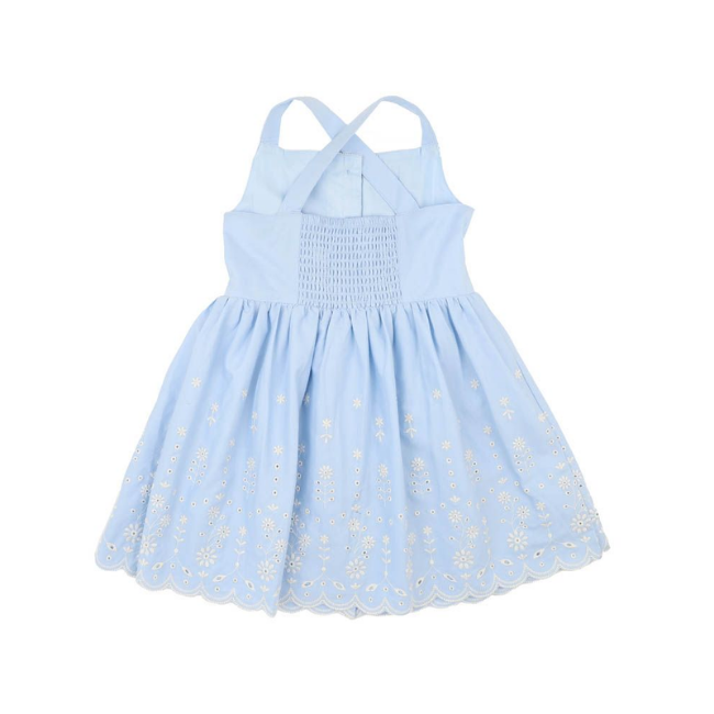 The soft blue cotton is scattered with embroidered daisies and finished with a scalloped hem for a timeless, sun-kissed look. With its cross-back straps and gathered skirt, it’s made for twirling, skipping and everything in between.