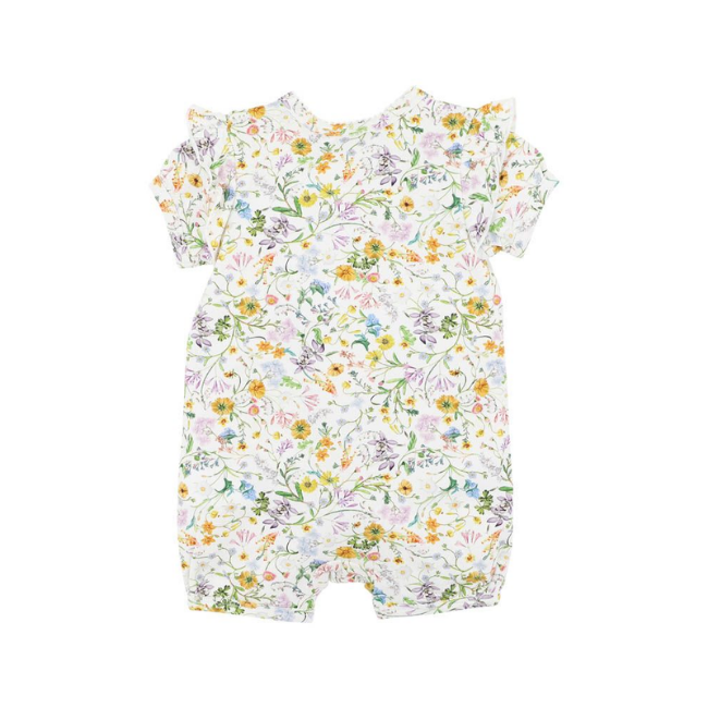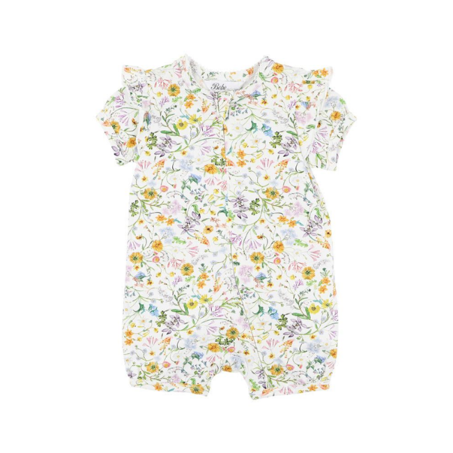 Perfect for playdates or peaceful naps, this cheerful all-in-one features fluttery shoulder frills and a whimsical floral print that feels like a spring garden stroll.