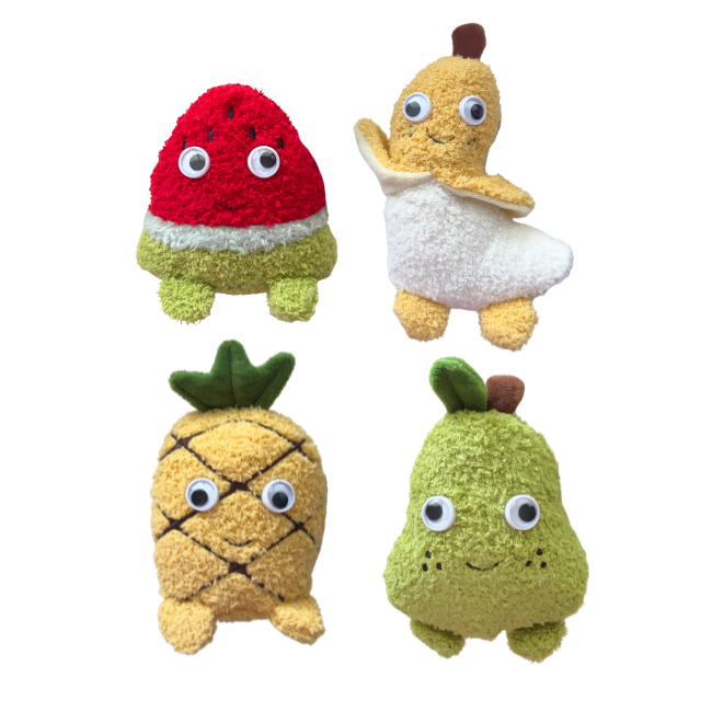 Meet the cutest crew of plush fruit plushies—pineapple, watermelon, banana, and pear—each with wobbly, movable googly eyes that bring them to life!