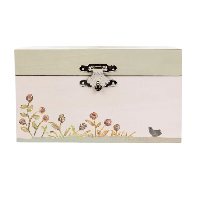A tiny treasure chest transforms bedtime into something magical. Lift the hinged lid and discover a secret world where delicate roses bloom alongside a cheerful grey bird, all painted by hand on soft pink wood.