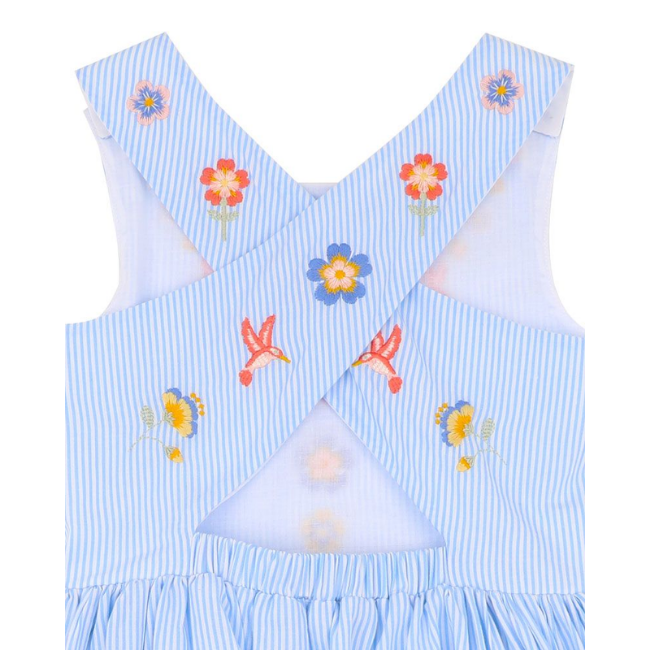 The soft blue stripe sets off the colourful floral details, while the crossover back straps bring a playful twist to the classic silhouette. Fully lined for comfort, it's designed for twirling, exploring, and everything in between.