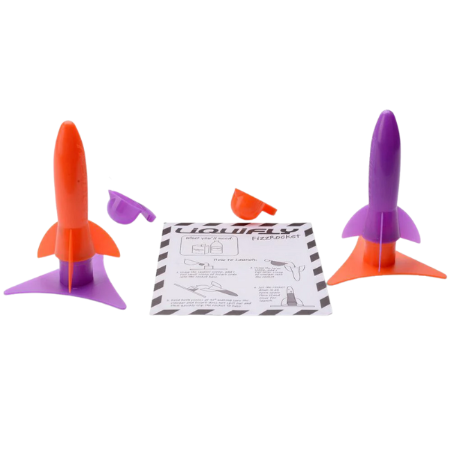 Heebie Jeebies - Liquifly: Fizz RocketThis mini rocket can be launched again and again with the explosive power of bicarb and vinegar. The Fizz Rocket is filled with these 2 household items which create a chemical reaction that makes a build-up of carbon dioxide which shoots out the base of the rocket and shoots the rocket up.
