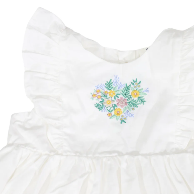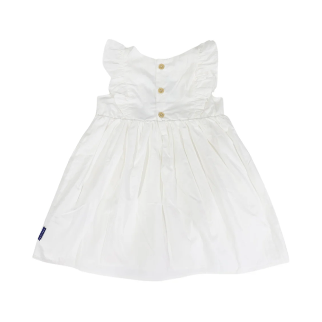 This adorable dress is perfect for summer and crafted with lightweight, breathable cotton lawn fabric. This adorable dress is perfect for summer and crafted with lightweight, breathable cotton lawn fabric. Fully lined and finished with beautiful wooden buttons down the back with delicate floral embroidery and frilled detailing on the bodice, this dress is a must-have in any wardrobe.