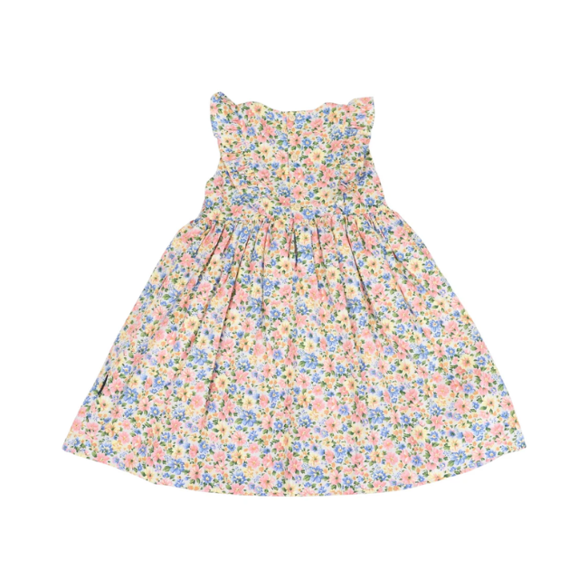 This charming dress features delicate smocking across the bodice, adding a beautiful, artisanal touch to its soft floral design. It is fully lined, has a button down closure and a tie up bow on the back.