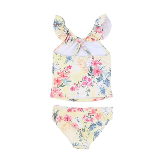 Minihaha Swim - Milana Yellow: TankiniA cheerful two-piece set made for sunny days, this yellow tropical tankini is full of holiday charm. Featuring a flutter-shoulder top with crossover back straps and coordinating bottoms, it’s a breezy, playful look young ones will love to splash about in.