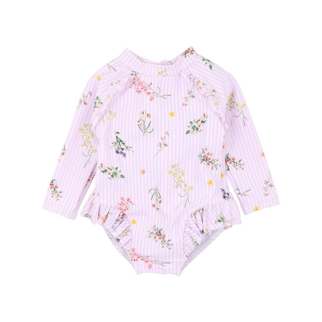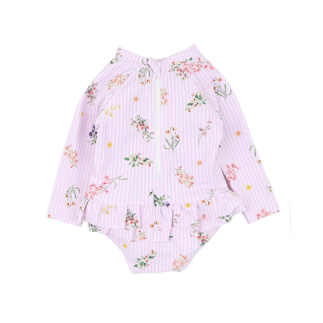 Scattered with delicate florals on soft pink stripes and finished with gentle frills at the front raglan seams and legs, it's as pretty as it is practical. The built-in aqua nappy ensures little ones stay comfy in and out of the water, while a back zip makes change time easy.