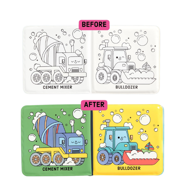 This charming bath book reveals colours when wet, bringing construction vehicles to vibrant life. With six colour-changing pages, it’s perfect for captivating babies and toddlers, adding a touch of enchantment to their bath time routine.