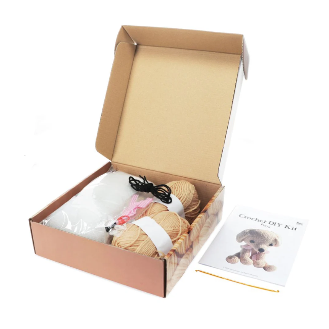 Perfect for intermediate crocheters, this all-in-one kit offers everything you need to create a loveable, 16cm-tall puppy companion—whether as a sweet keepsake for yourself or a thoughtful handmade gift for someone special. Designed to help you grow your crochet confidence, the kit includes three strands of yarn in coordinating colours, stuffing, a crochet hook, and charming finishing touches like safety eyes and a ribbon.