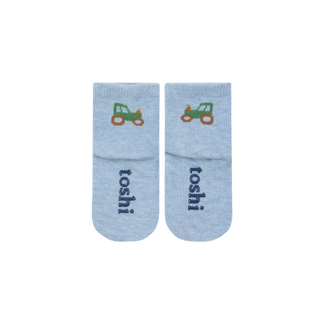 Toshi - Organic Baby Socks Jacquard: Tiny TractorsToshi presents a beautifully curated collection of organic cotton baby socks. Crafting of the socks evolves from a blend of finely textured organic cotton melange yarn. Our cotton yarn is certified organic and this ensures Toshi socks are gentle on delicate baby feet, as well as our precious environment.