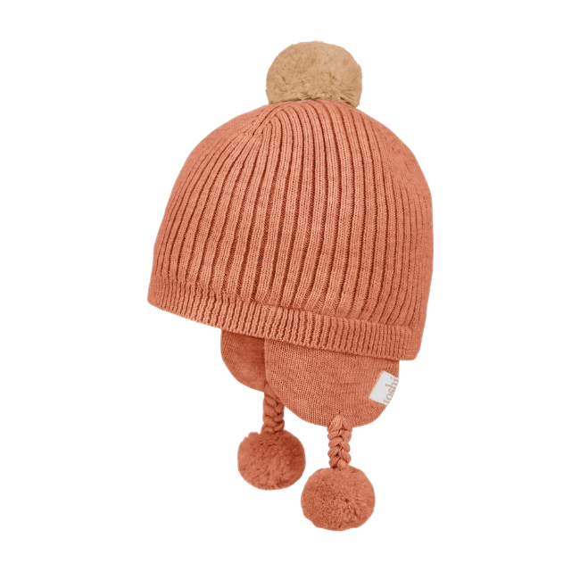 The beautifully textured melange knit introduces an element of natural refinement. The Toshi baby beanie features ear flaps for cosy warmth and nurturing protection from the elements. A classic fine ribbed knit design creates timeless style. A contrast pompom introduces a cute and whimsical feel. The baby beanie Organic Earmuff Bobby is fully lined with 100% organic cotton.