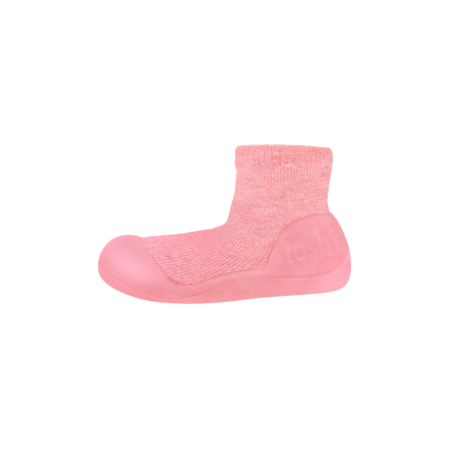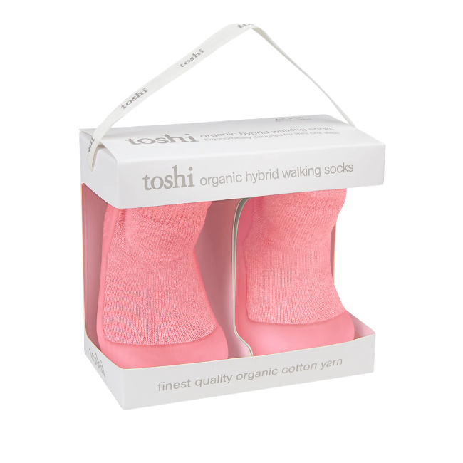 Toshi - Organic Hybrid Walking Socks Dreamtime Footsteps: Winter RoseToshi Organic Hybrid Walking Socks are ergonomically designed for life’s first steps. Our fusion shoe-socks feature an inner sock crafted from the finest quality organic cotton yarn. The organic cotton is soft and gentle on delicate feet, as well as our precious environment. Rubber soles cushion each step, providing flexibility, balance and stability.