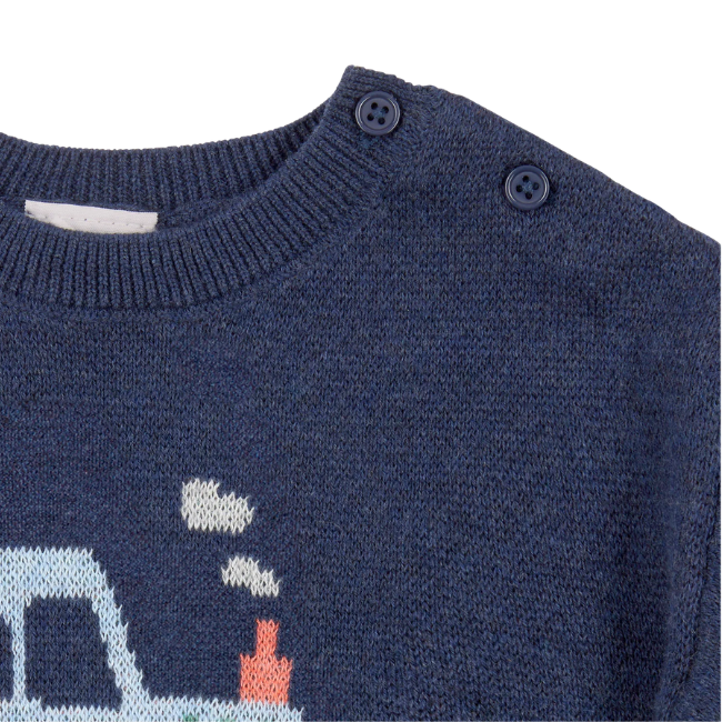Beautifully textured melange yarn introduces a handcrafted feel and a level of natural refinement to this cosy and nurturing Toshi baby pullover. A playful, artisan jacquard knit design is featured. Buttons on the shoulder enhance functionality, making it effortless to dress and undress your baby. Ribbed knit cuffs provide a snug and comfortable fit. The styling is relaxed and creates a classic and yet contemporary look.